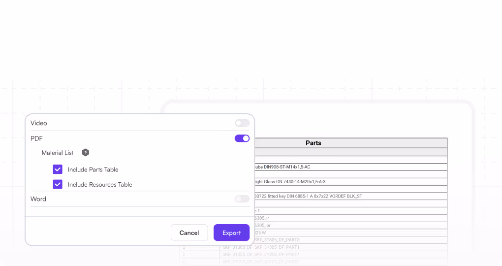 Assemblio generiert aus Ihren CAD-Daten automatisch Montageanweisungen und Stücklisten. Änderungen werden zentral verwaltet und wirken sich direkt auf alle betroffenen Varianten aus – für eine reibungslose Übergaben in die Fertigung.