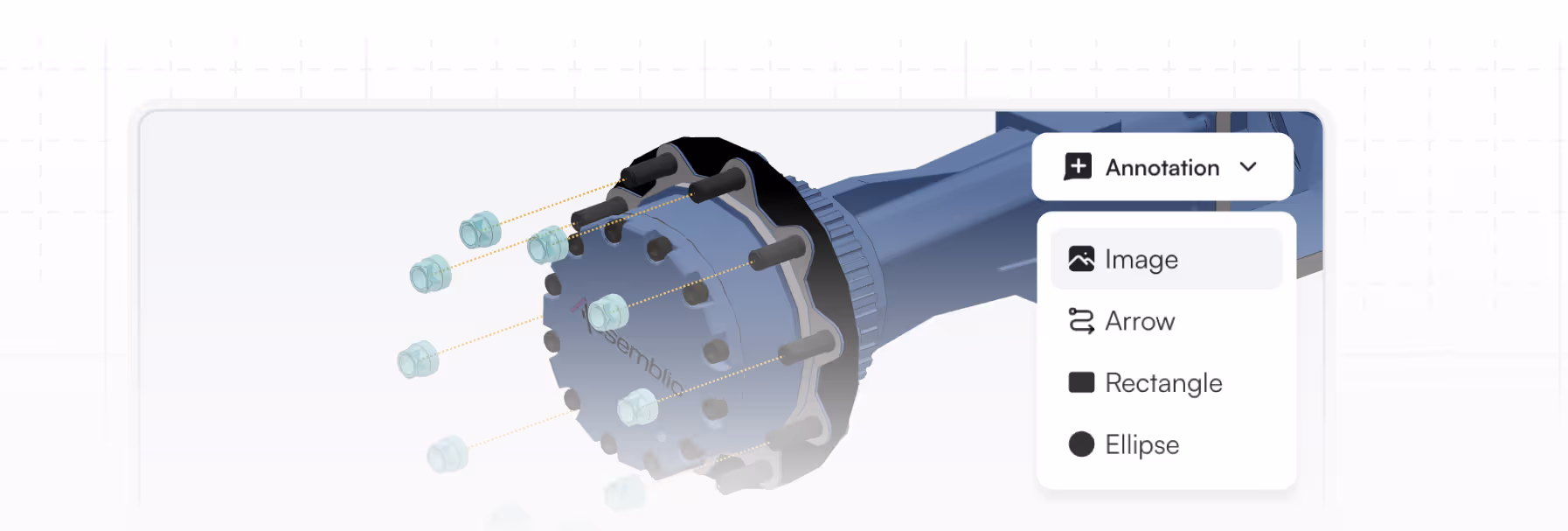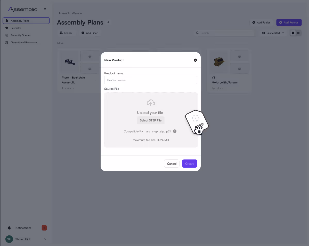 Laden Sie Ihr 3D-Modell direkt hoch. Assemblio erkennt automatisch Struktur, Bauteile und Baugruppen. Kompatibel mit gängigen CAD-Formaten wie .step und .jt.