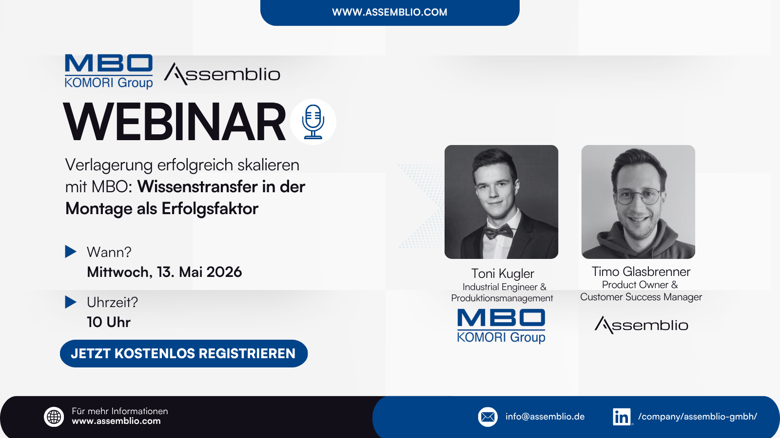 Standardisierte Montageprozesse sind die Grundlage für Wachstum und Resilienz. Assemblio reduziert operative Abhängigkeiten, sichert Wissen langfristig und macht Ihre Organisation fit für digitale Skalierung.