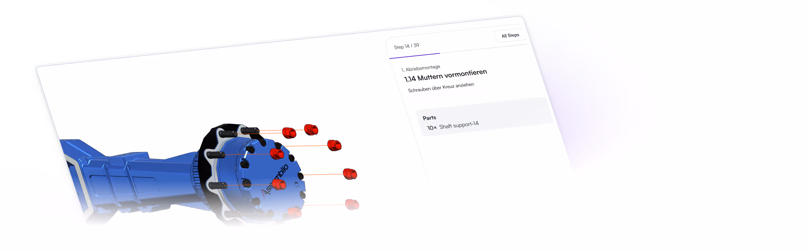 Interaktive 3D-Montageanweisungen machen Abläufe sofort nachvollziehbar. Für sicheres Arbeiten, schnelle Einarbeitung und weniger Fehler